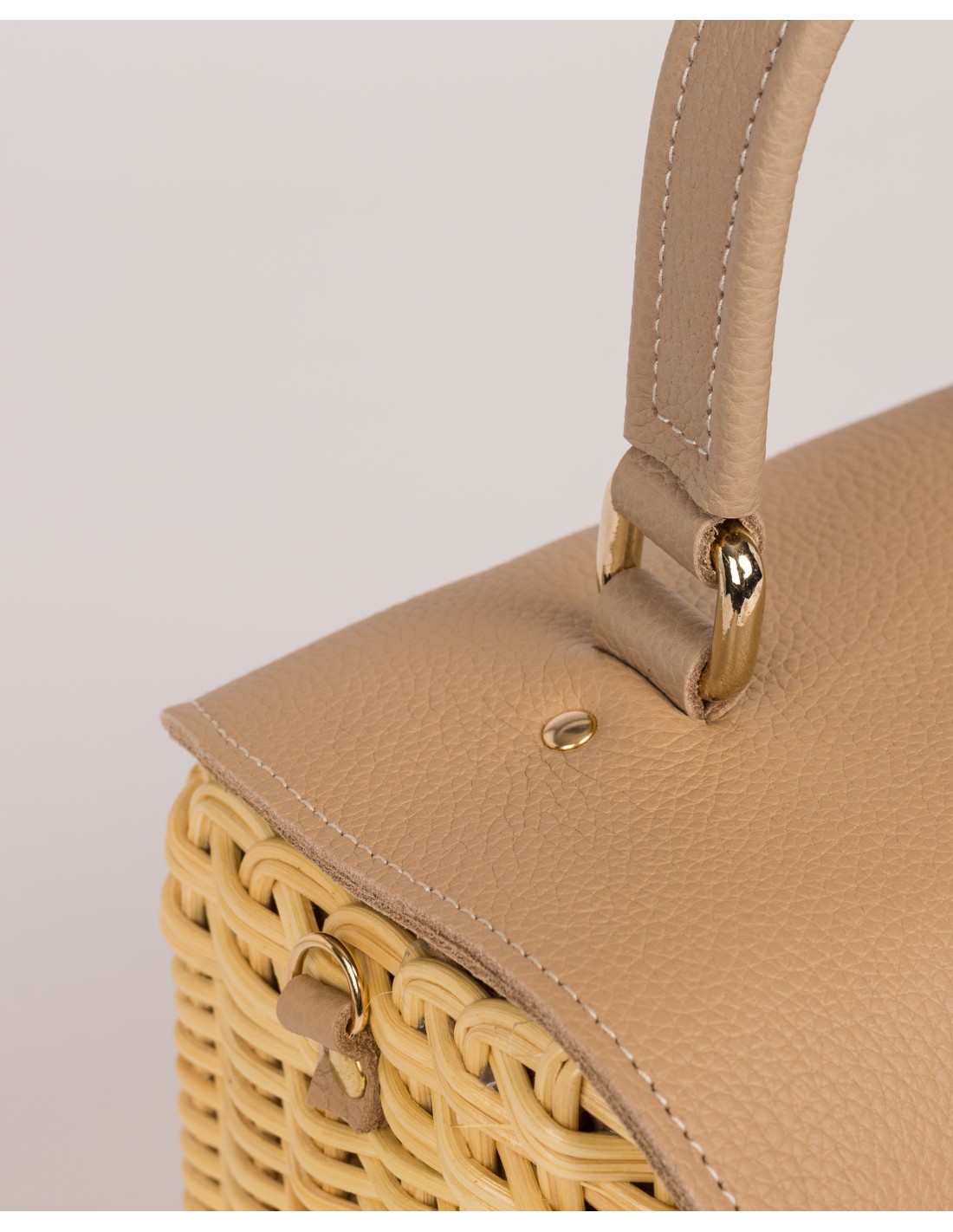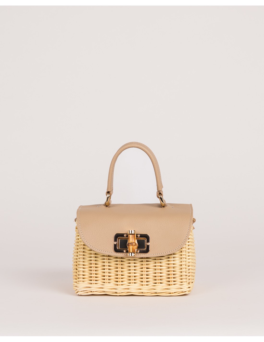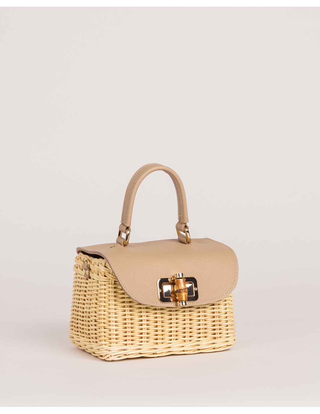 Bag crafted from natural rattan cane and leather, fully lined, with a removable chain strap and bamboo clasp.