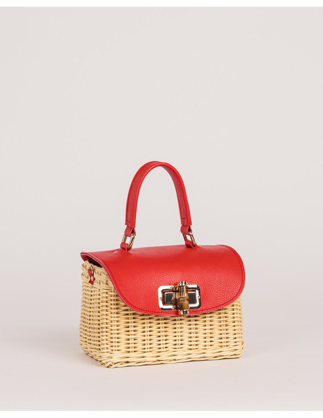 Bag crafted from natural rattan cane and leather, fully lined, with a removable chain strap and bamboo clasp.