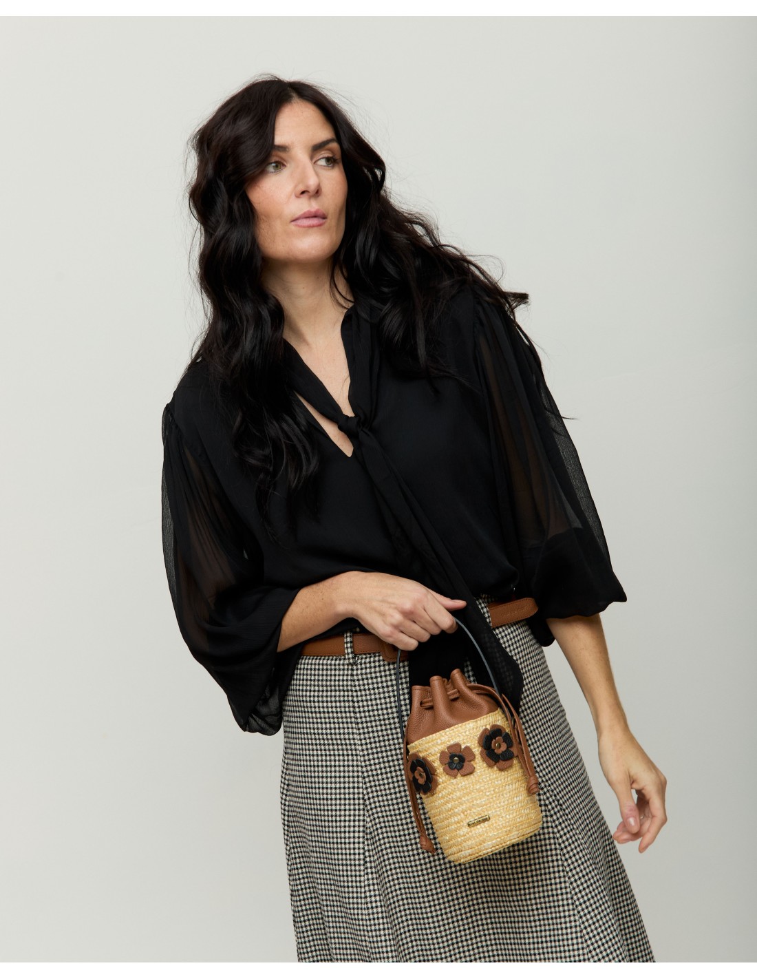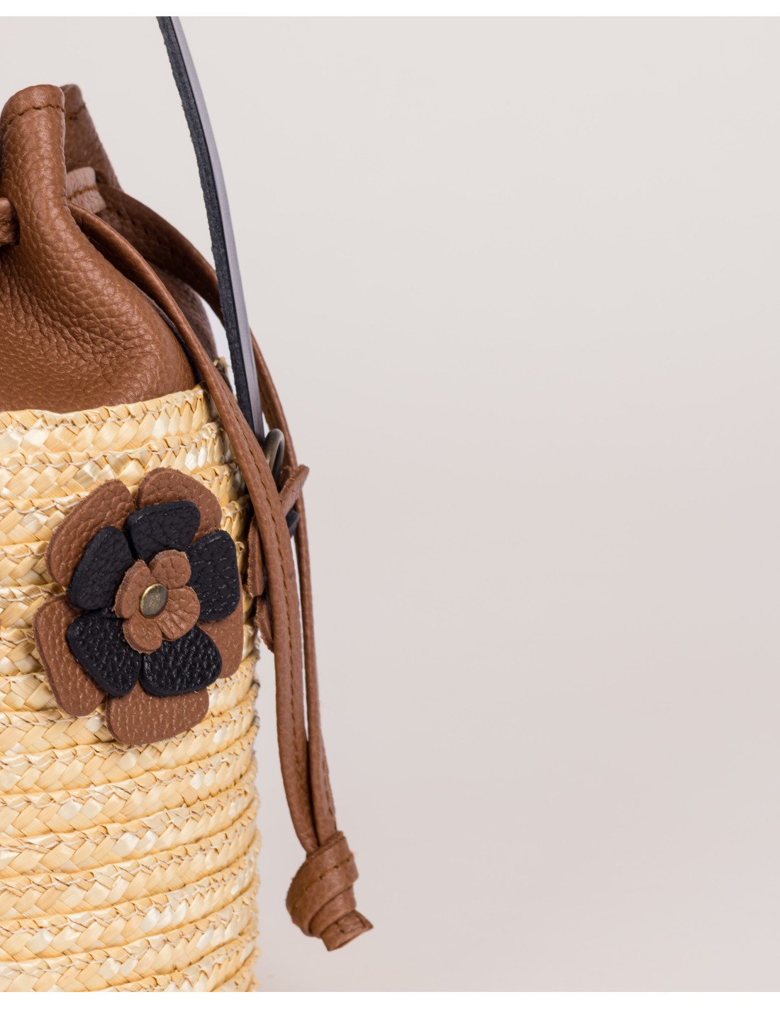 The Bartola bag brings together natural vegetable fibre and leather details for a balanced, timeless look. Its leather drawstring closure shapes the bag and keeps your belongings secure, while the applied leather flowers add a unique and feminine touch.