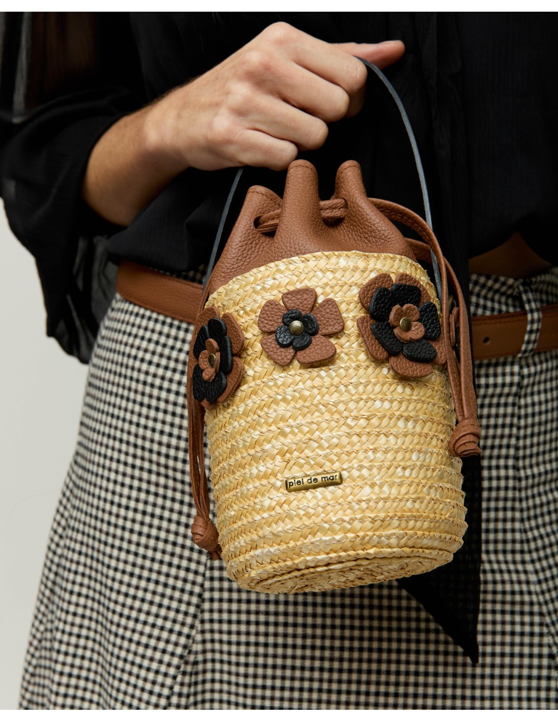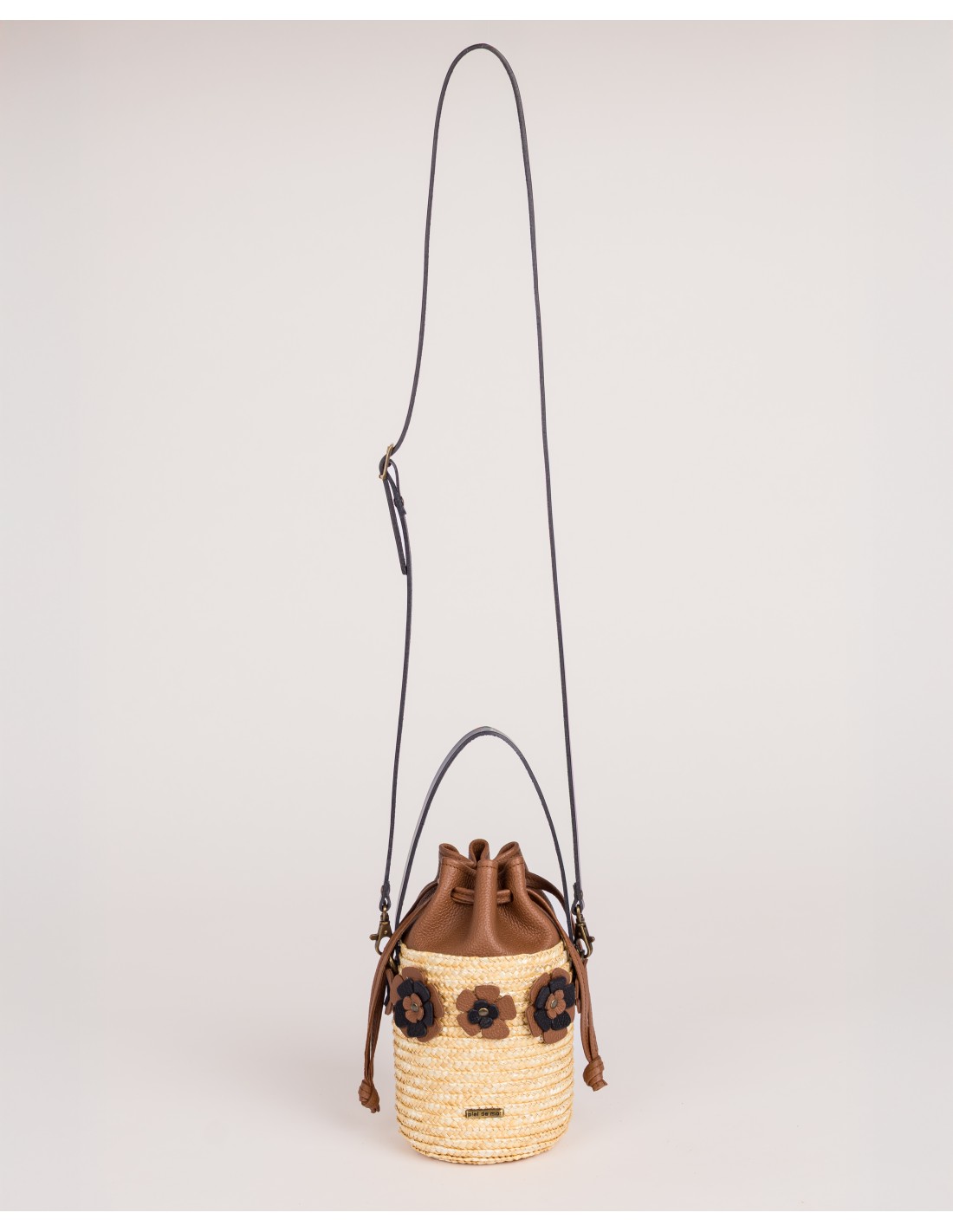 Bartola is a bucket-style bag made of vegetable fibre, featuring a leather drawstring closure and applied leather flowers. A lightweight and distinctive design, created to carry just the essentials, with a removable leather crossbody strap.