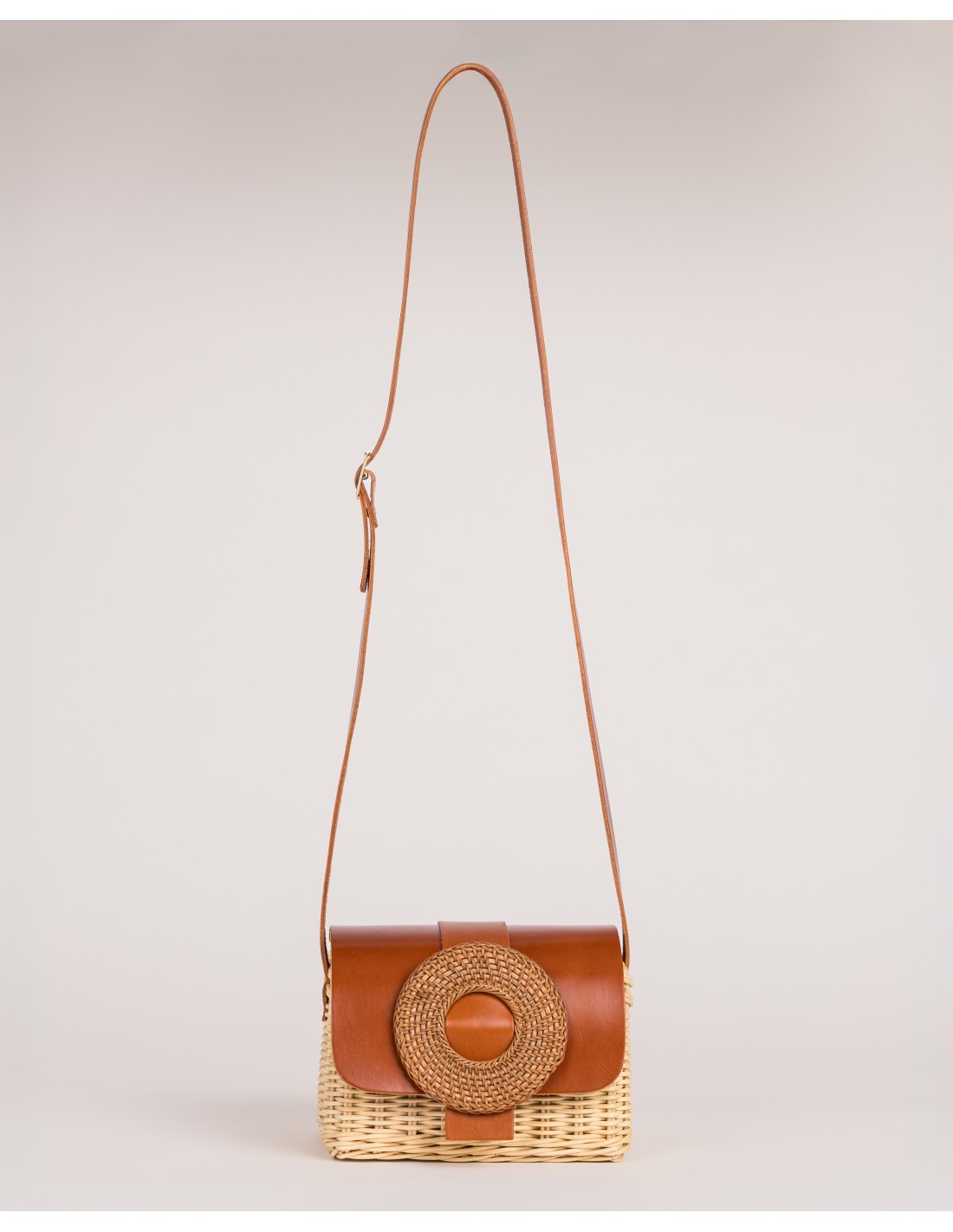 The Simona rattan bag is made from natural rattan cane, a material known for its lightness and structure. Its clean silhouette is complemented by leather details, including the front closure and a leather crossbody strap, allowing it to be worn comfortably across the body or on the shoulder.