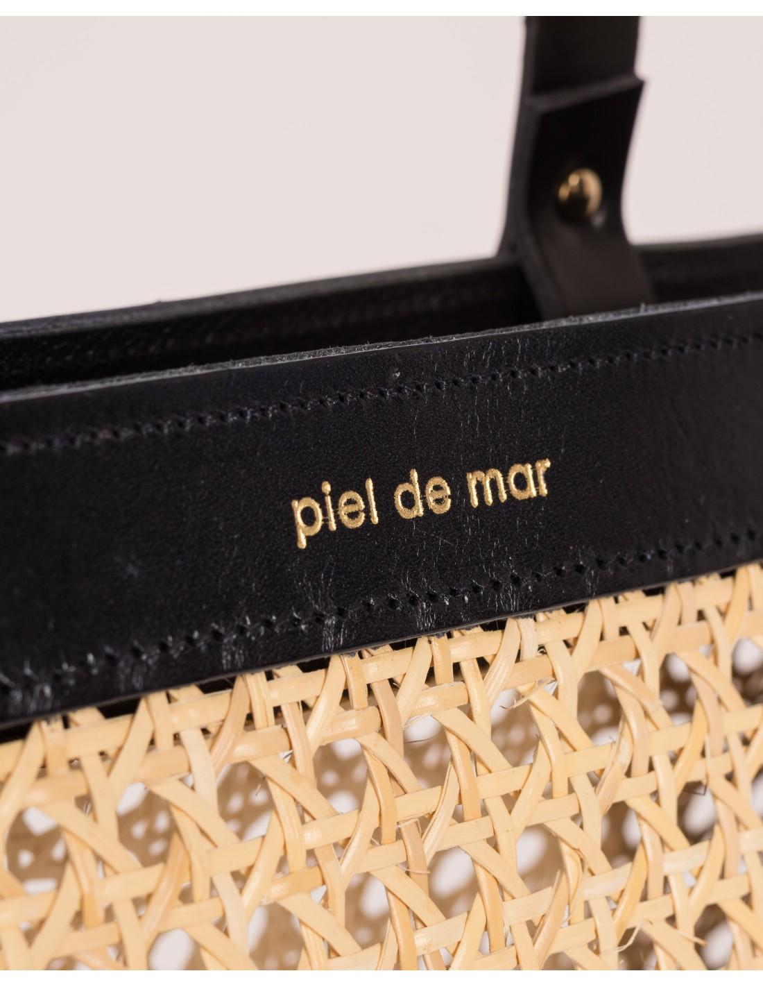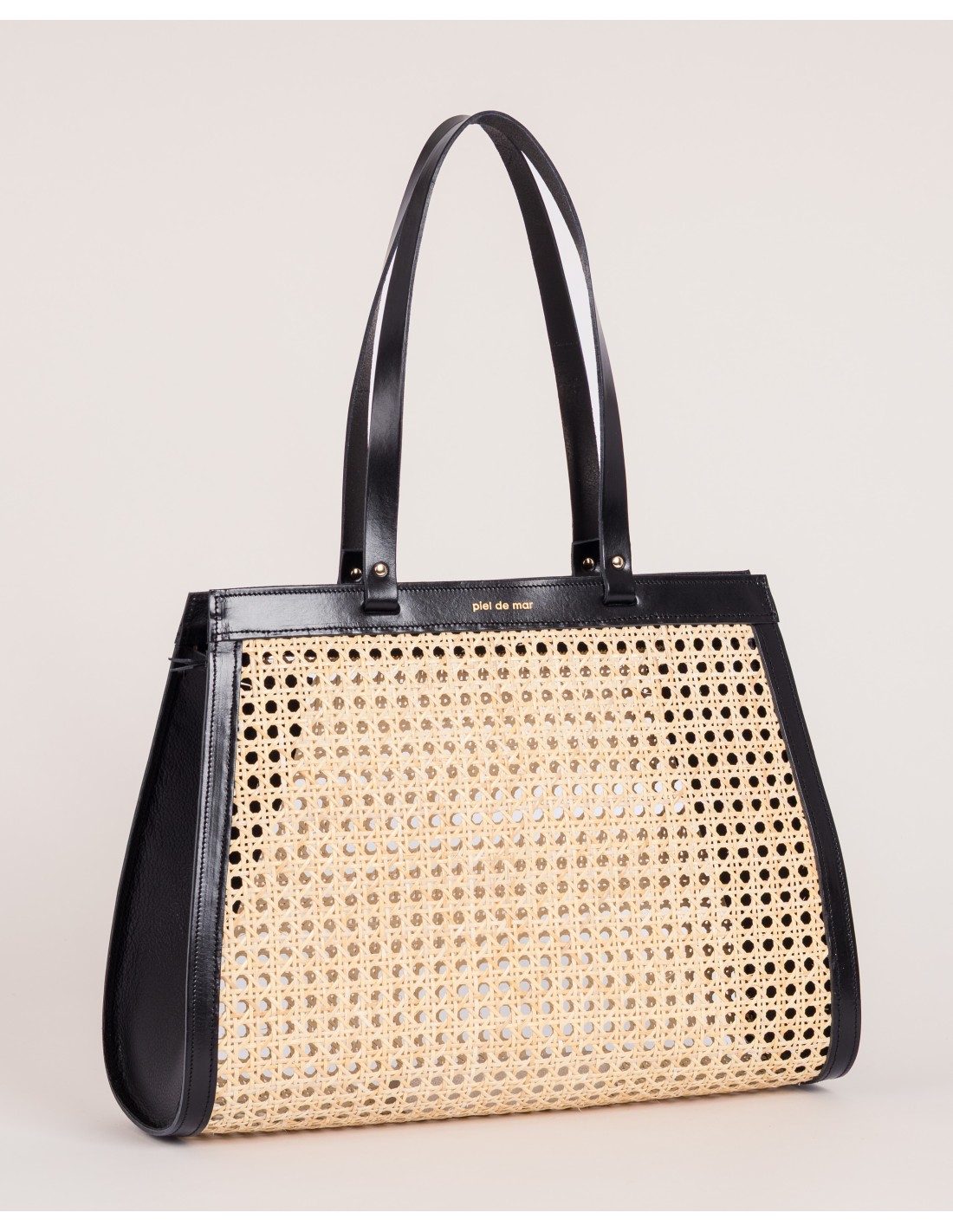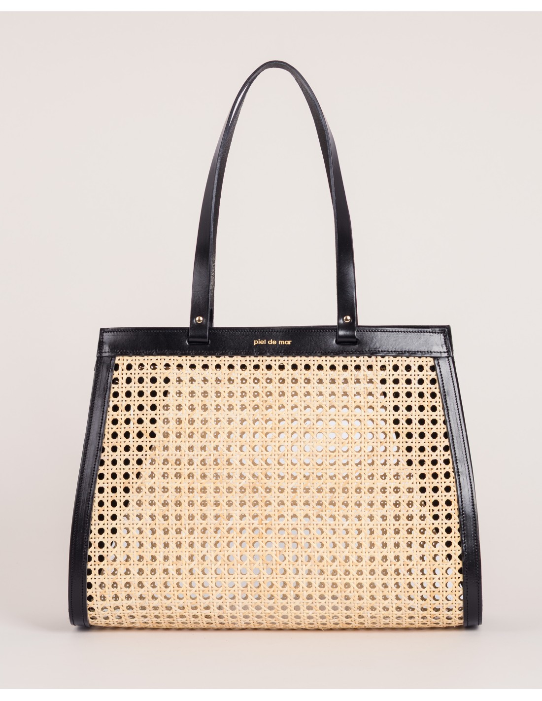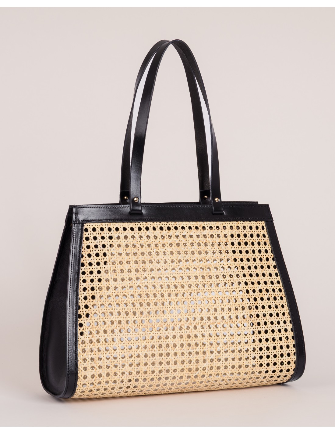 Large tote bag in natural cane and leather, lightweight and designed for everyday use.