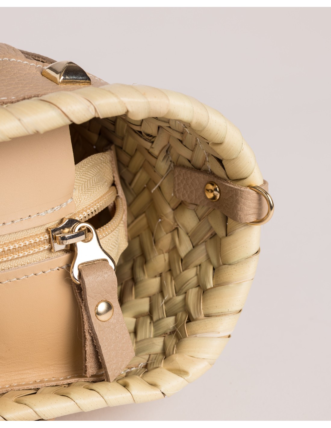 Mini basket bag handwoven from natural palm, finished with leather details and a bold character. Closed with a zip and leather gussets, unlined, with a chain strap to wear on the shoulder or crossbody.