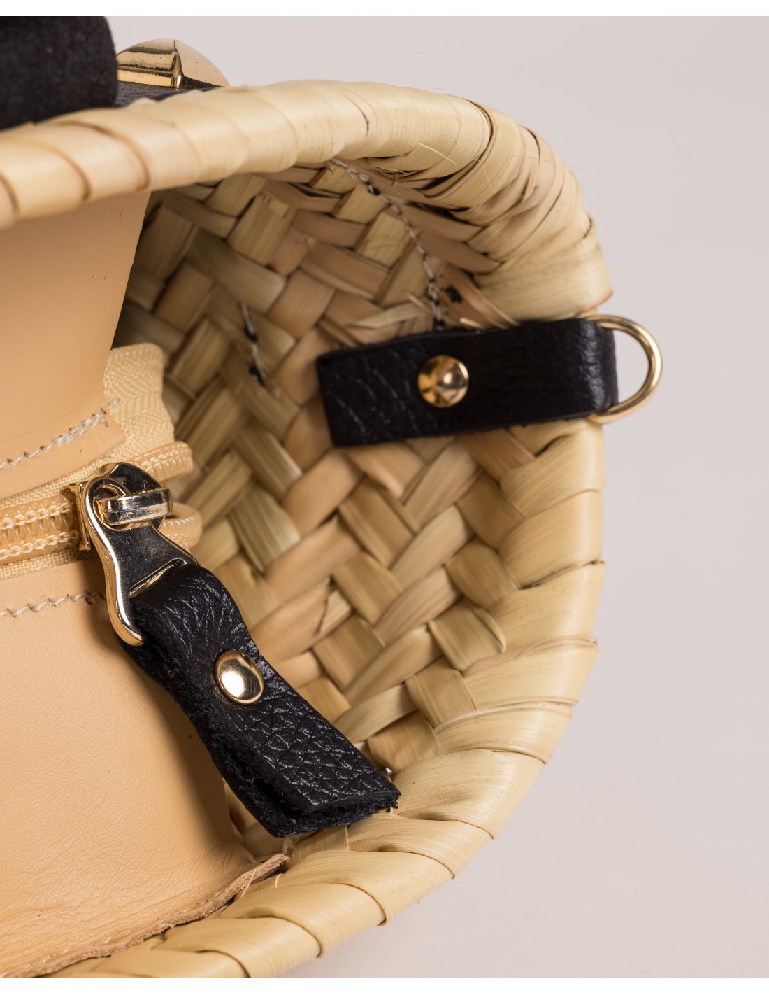Mini basket bag handwoven from natural palm, finished with leather details and a bold character. Closed with a zip and leather gussets, unlined, with a chain strap to wear on the shoulder or crossbody.