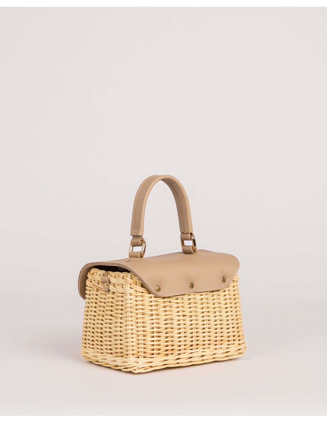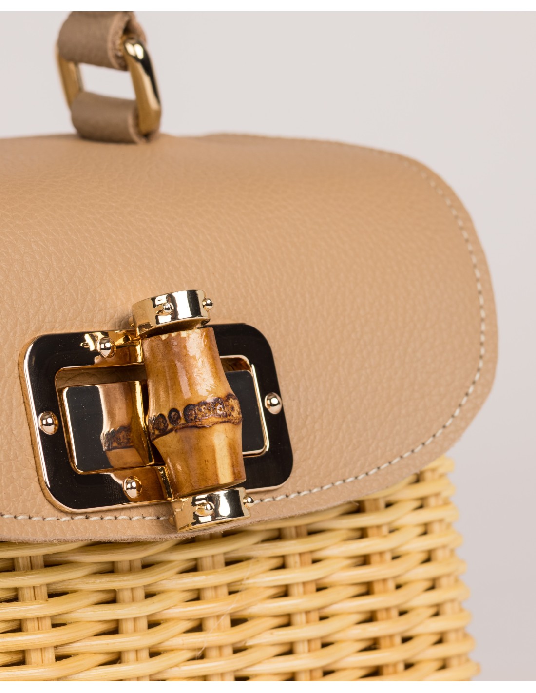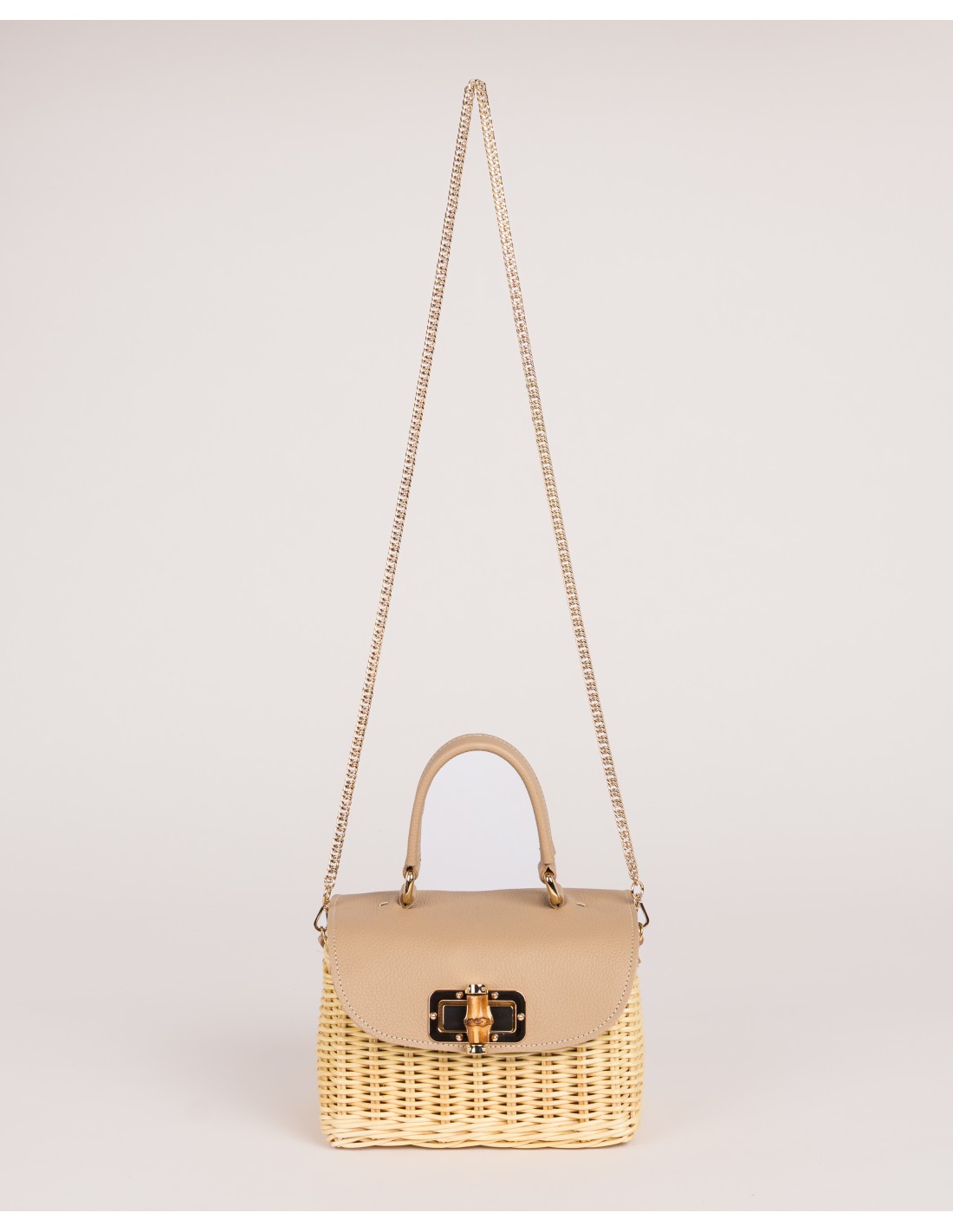 Bolso de fibra natural y piel, forrado, con broche de bambú y asa de cadena de quita y pon.