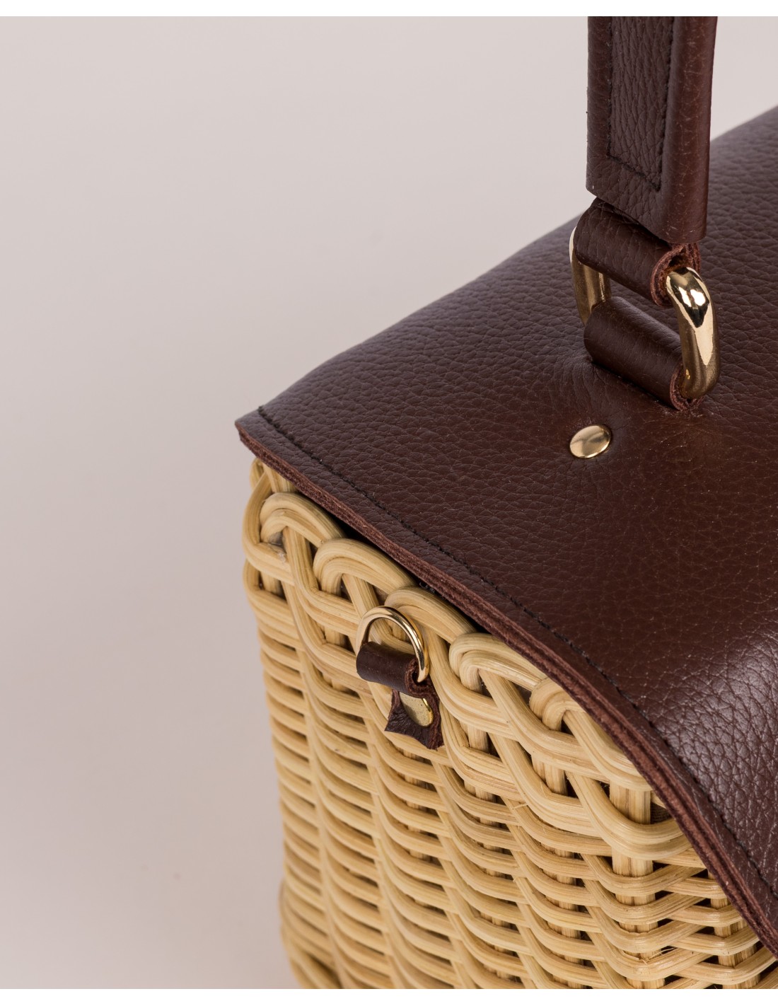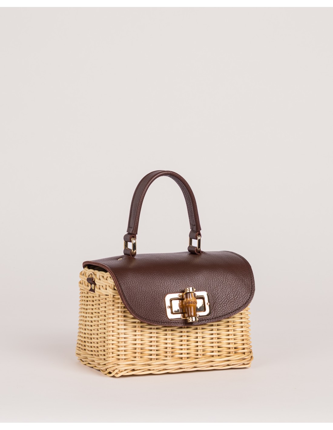 Va completamente forrado y cuenta con un asa de cadena de quita y pon, que permite llevarlo al hombro o como bolso de mano. El broche de bambú aporta un cierre seguro y un detalle natural que define su carácter.
