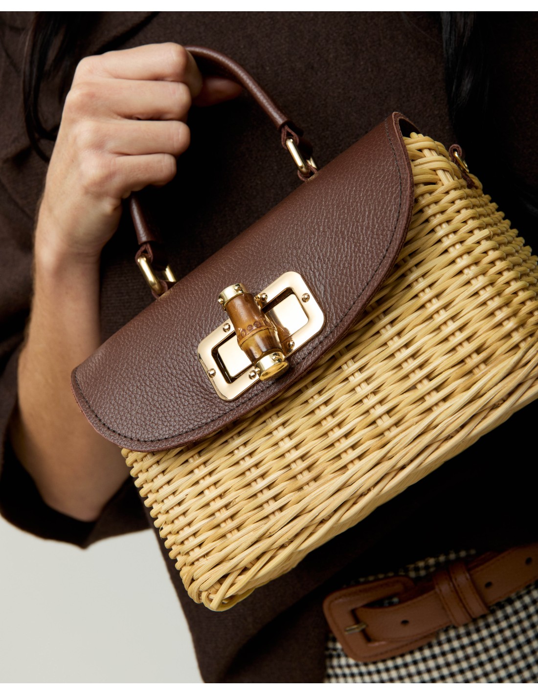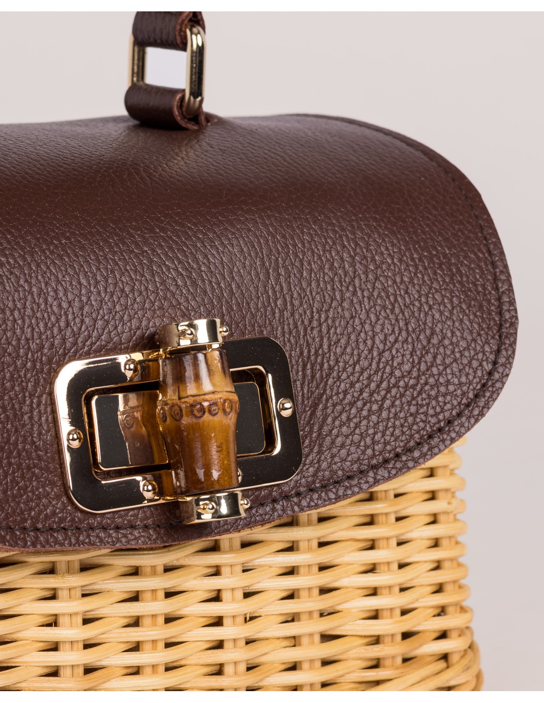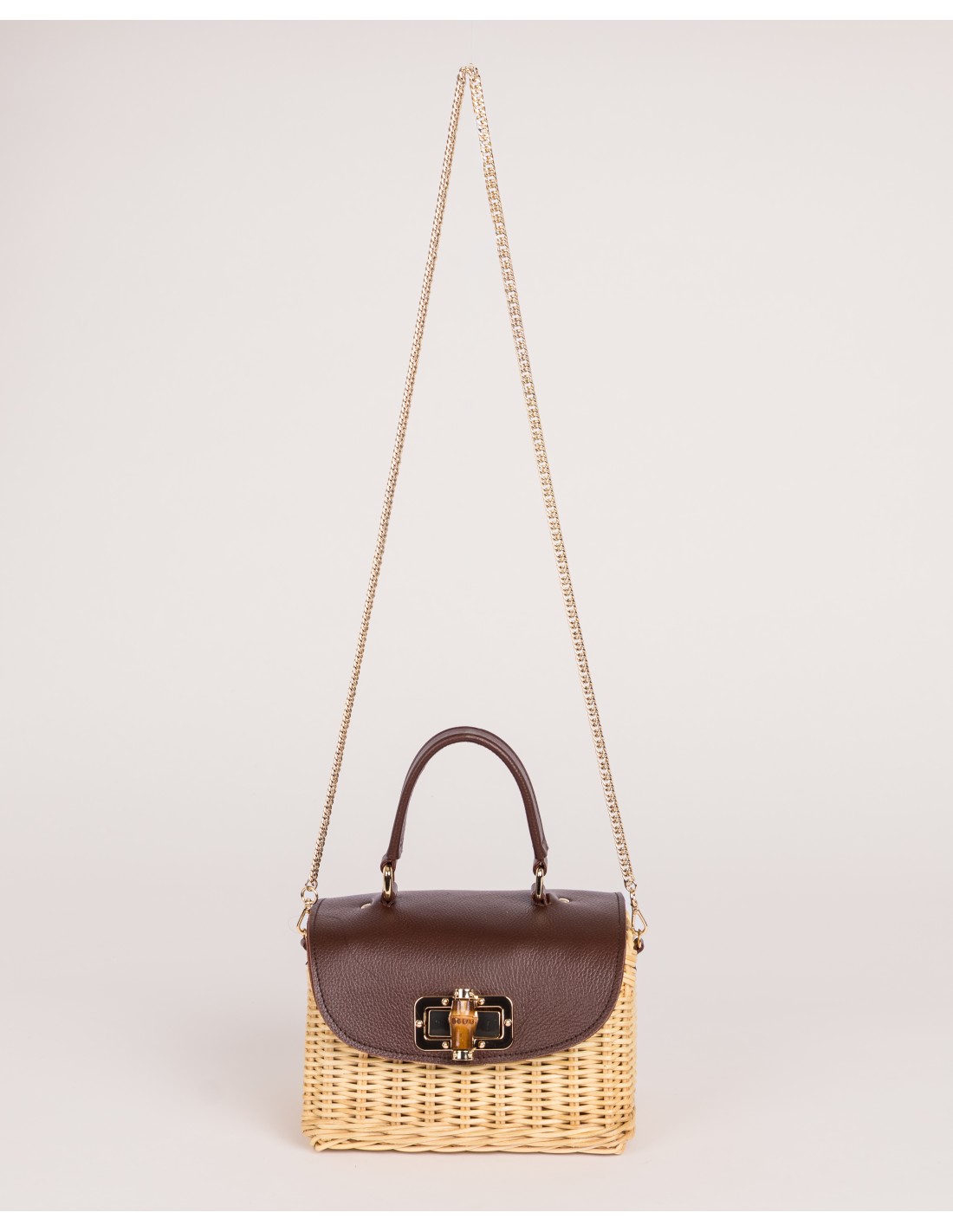 Bolso de fibra natural y piel, forrado, con broche de bambú y asa de cadena de quita y pon.