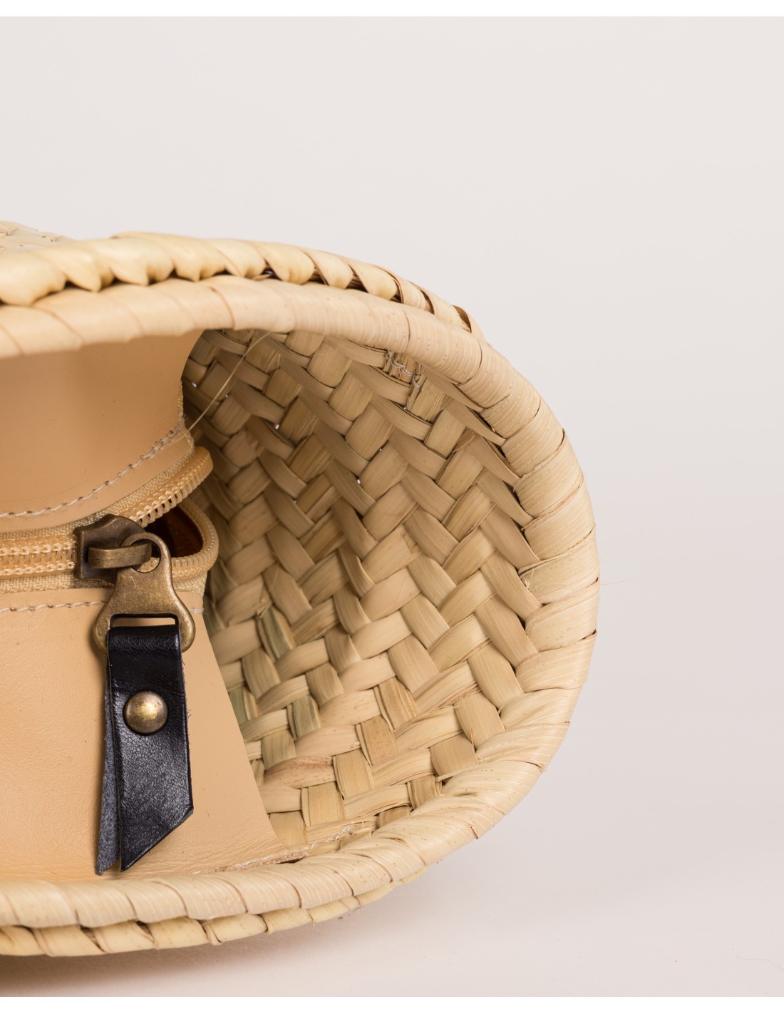 Capazo pequeño tejido a mano en fibra natural y combinado con piel, pensado para el día a día. Ligero, cómodo y cerrado con cremallera para llevar lo esencial con tranquilidad.