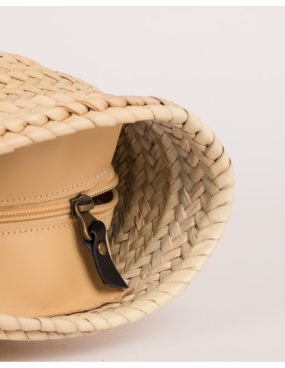 Capazo mediano tejido a mano en fibra natural y piel, pensado para el día a día. Amplio, cómodo y cerrado con cremallera, ideal para llevarlo todo sin renunciar al estilo.