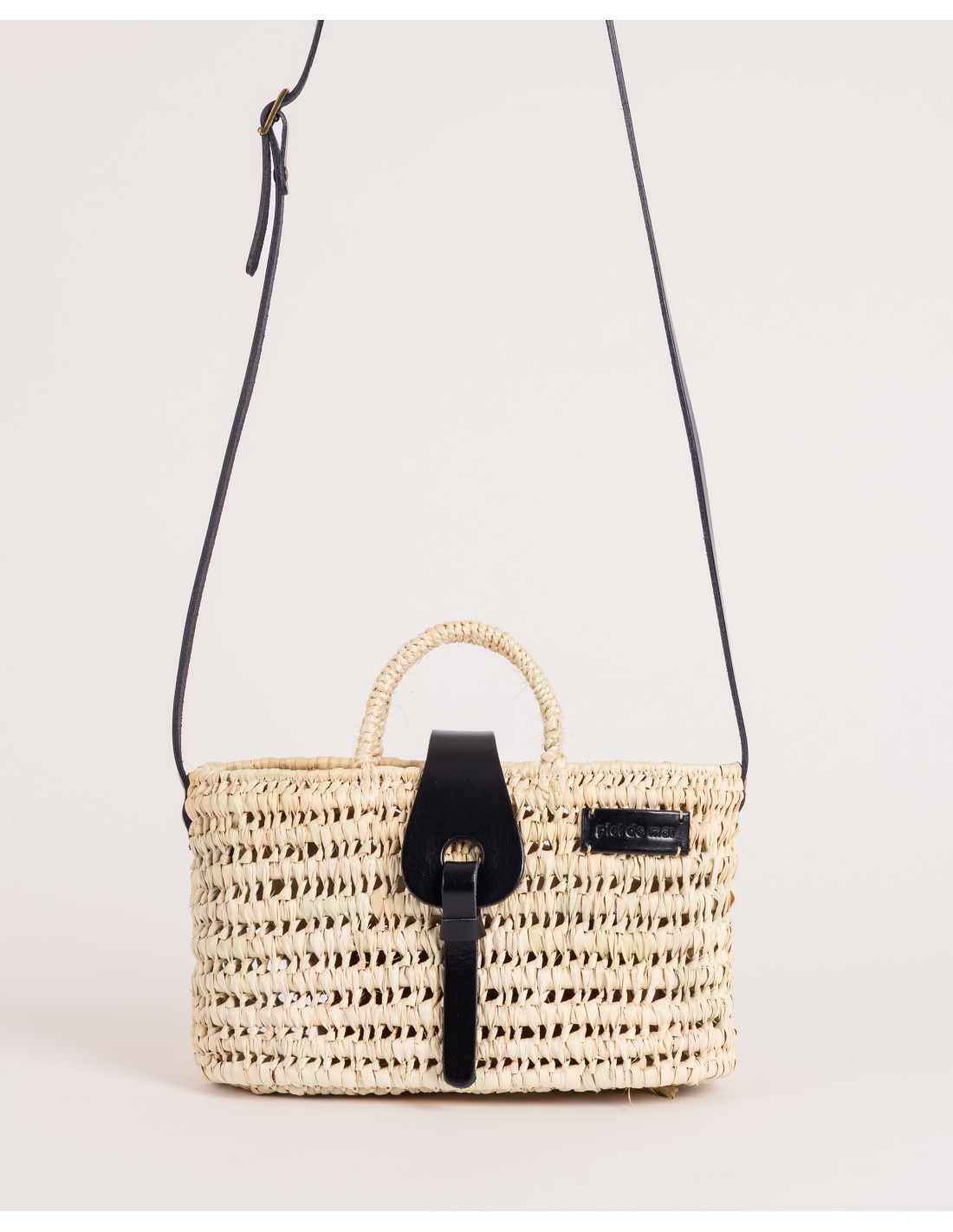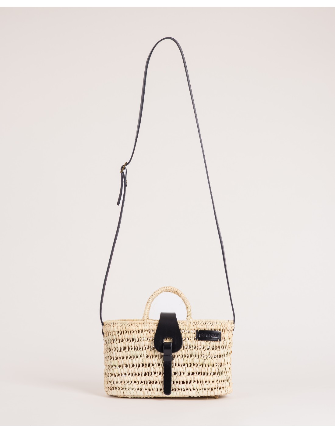 Bolso de fibra natural trenzada con detalles de piel, sin forro, con cierre de cremallera y solapa tipo pasador.
