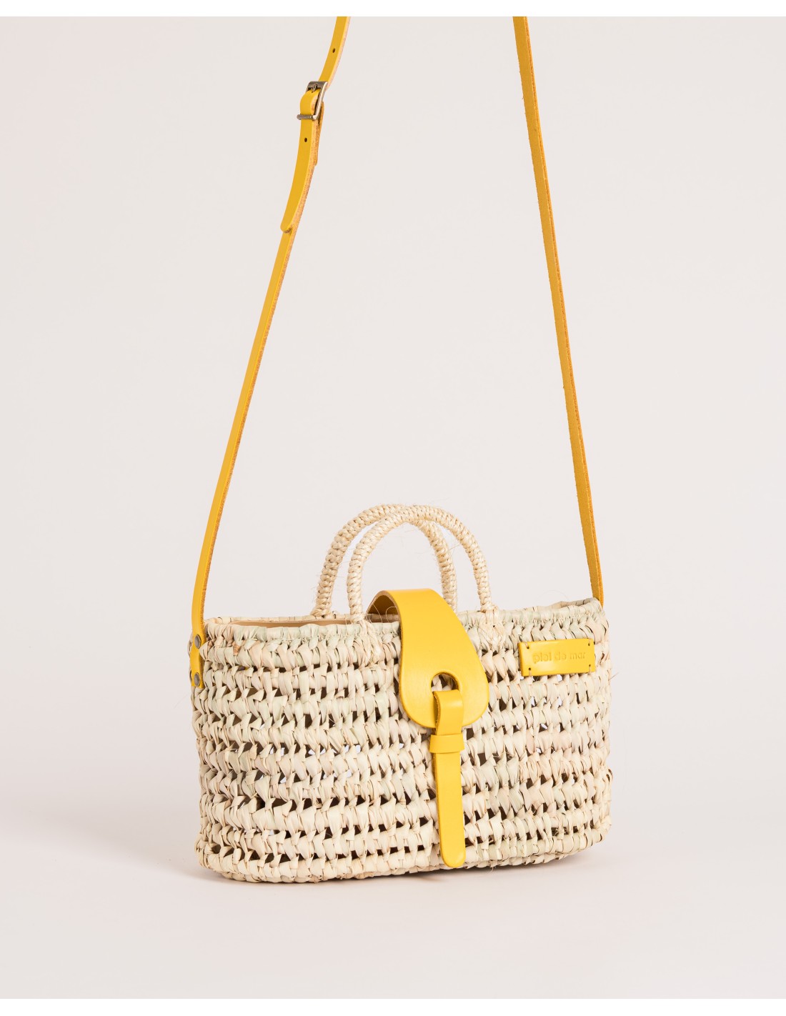 Bolso de fibra natural trenzada con detalles de piel, sin forro, con cierre de cremallera y solapa tipo pasador.