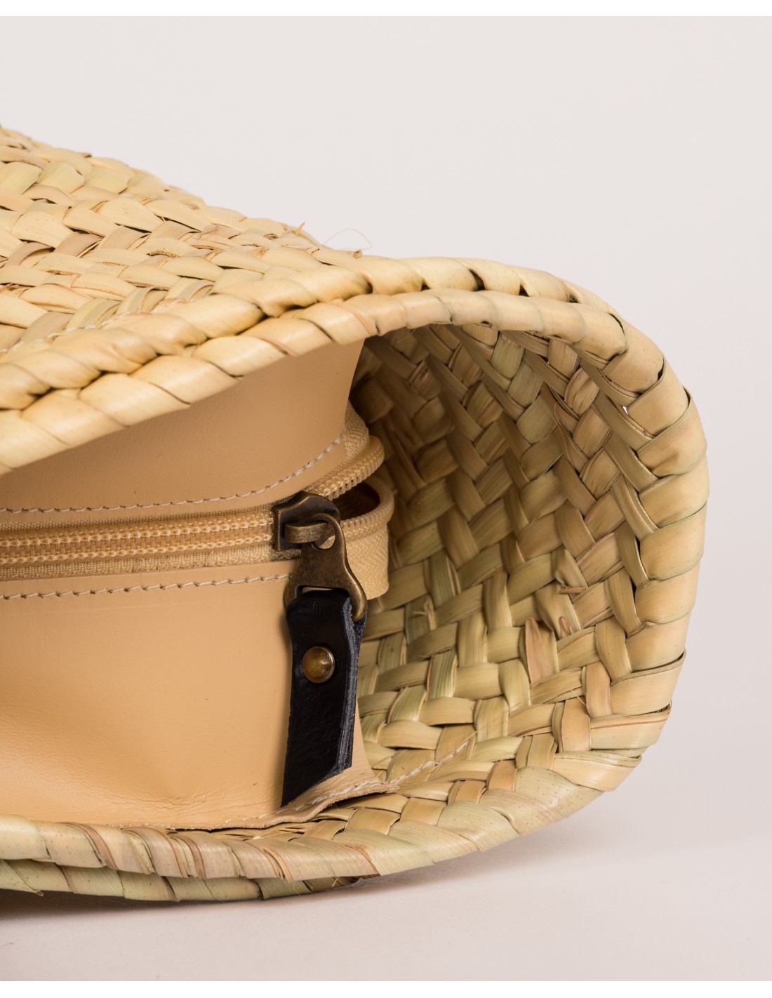 El interior va sin forrar, respetando la ligereza y la esencia del capazo, y cuenta con cierre de cremallera con fuelles de piel, que aporta seguridad sin restar comodidad ni amplitud.