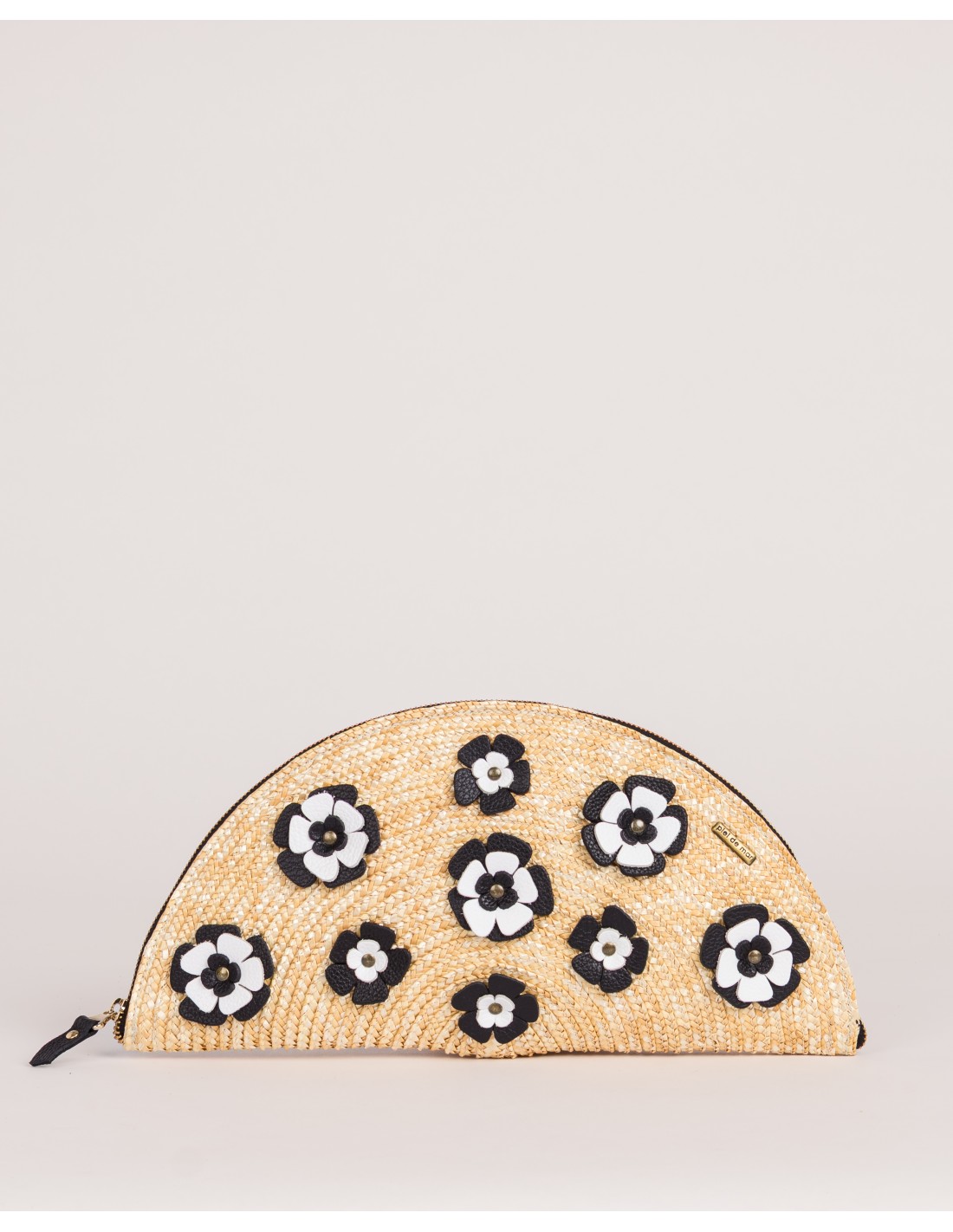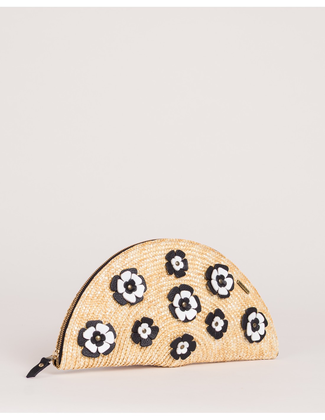 El bolso Carmen está elaborado en fibra natural trenzada y decorado con flores de piel aplicadas, que aportan textura y personalidad al diseño.